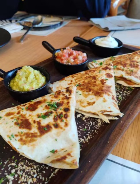 The quesadilla was a highlight, featuring a blend of mushrooms and cheese in a crispy tortilla. The dips that came with it were particularly tasty and enhanced the overall flavour of the dish.
